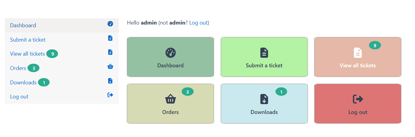 You can show customers order count and customer’s download count to both sidebar menu as well as dashboard links added by our plugin. You can also show any chosen custom post type count by user like tickets , coupons or any other cpt. This function is fully modular so you can create your own function with any custom data like rewards, wallet balance etc.